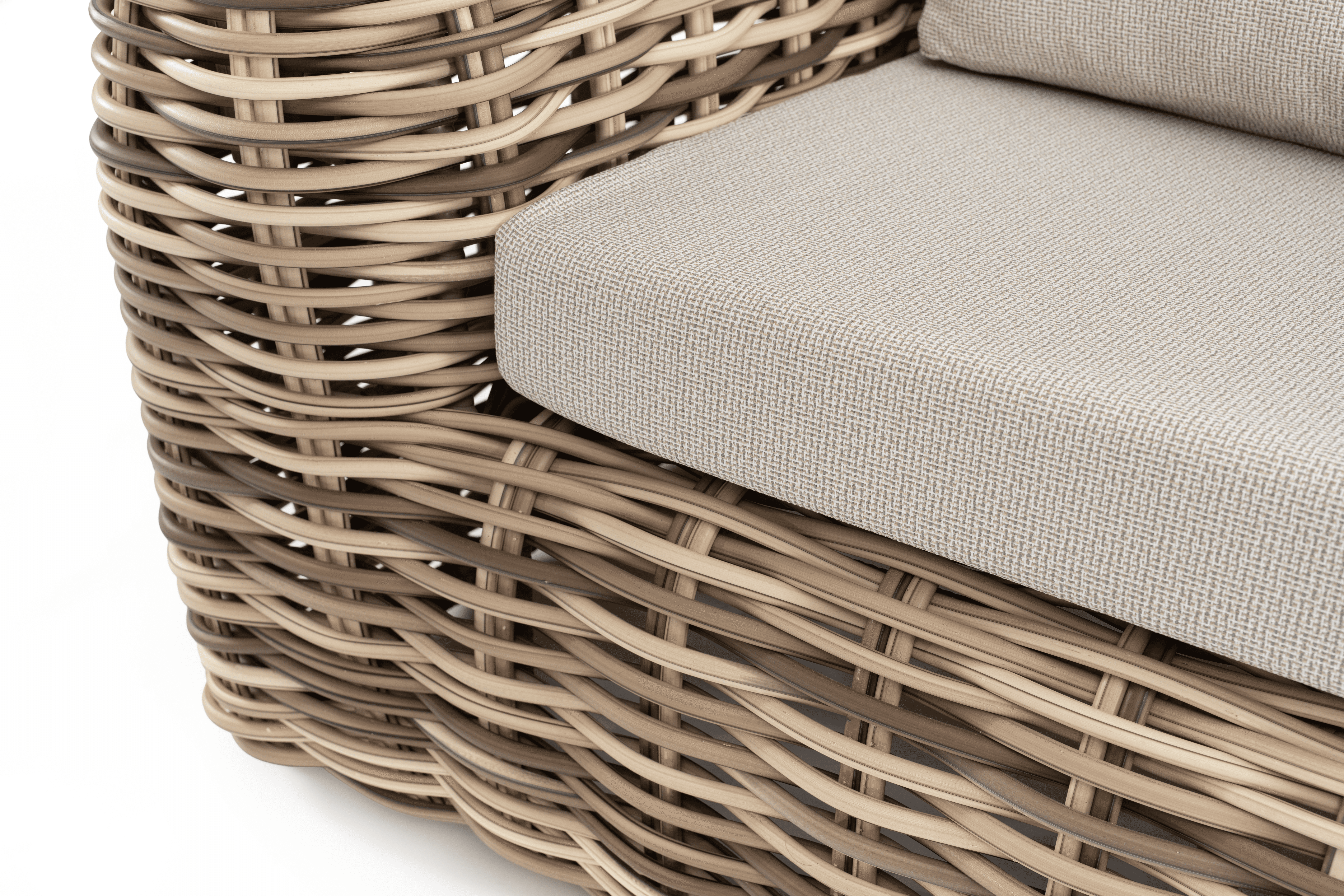 GAGAL, güçlü hacmi ve doğal dokusuyla açık alanlarda yalın ama etkileyici bir karakter ortaya koyar. Geniş ölçüleriyle mekâna hâkim olurken, tasarım diliyle dengeli ve sakin bir atmosfer kurar. 420 × 220 cm’lik yerleşimi, açık alanları sosyal bir merkez hâline getirir; rahatlığı ve estetiği aynı düzlemde buluşturur. 12 mm toup örgü yapısı, yüzeyde tok ve derin bir doku etkisi yaratır. Bu kalın örgü, GAGAL’ın güçlü duruşunu pekiştirirken aynı zamanda premium bir malzeme hissi sunar. Natural Mix renk tonu, doğadan ilham alan sıcak ve sofistike bir ifade oluşturur; çevreyle uyumlu ama karakterli bir görünüm sağlar. Tekli koltuk (125 × 95 × 72 cm) ve Kanepe (230 × 95 × 72 cm) modülleri, geniş oturum alanları ve alçak sırt formuyla rahat, içine alan bir konfor sunar. Uzun süreli kullanımlar için tasarlanan bu oranlar, konforu göz yormayan bir estetikle destekler. 120 × 70 × 55 cm ölçülerindeki sehpa, kompozisyonu tamamlayan sade ve işlevsel bir merkez parça olarak konumlanır. GAGAL, geniş bahçeler, teraslar ve doğal konseptli açık alan projeleri için ideal bir tercihtir. Zamansız çizgileri, güçlü dokusu ve doğal renk diliyle bulunduğu mekâna kalıcı bir değer katar.