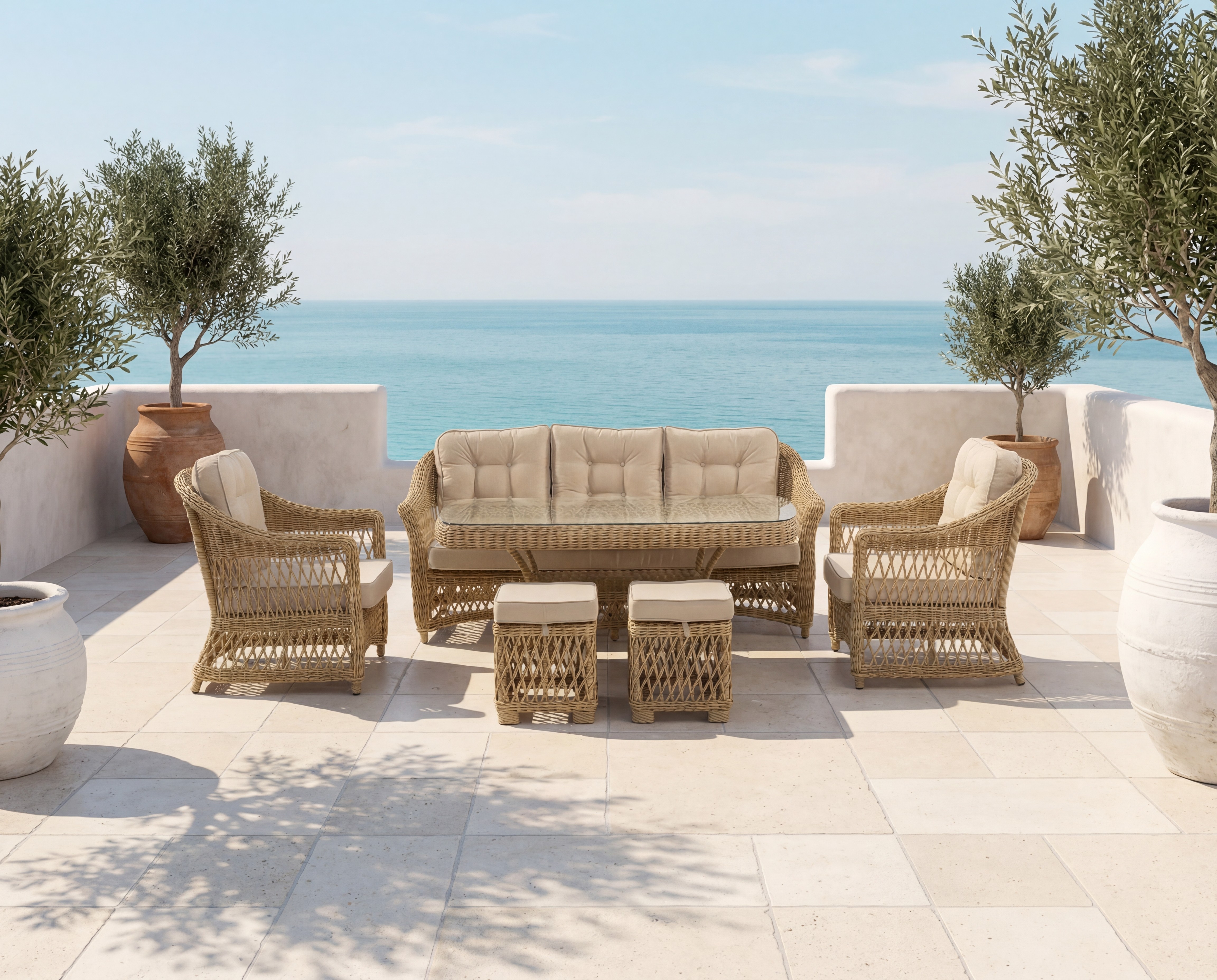 TEGAL, güçlü hatları ve net oranlarıyla açık alanlarda modern bir duruş sergiler. Dengeli yerleşimi ve karakterli formu sayesinde bulunduğu mekânda düzenli, sakin ve sofistike bir atmosfer oluşturur. 350 × 210 cm’lik yerleşim ölçüsü, hem genişlik hem de kullanım kolaylığı sunarak yaşam alanını doğal bir merkez etrafında toplar. 5 mm putar örgü yapısı, tasarıma tok ve kontrollü bir yüzey etkisi kazandırır. Bu örgü dokusu, hem görsel hem de dokunsal olarak kalite hissini destekler. SAY-103 renk tonu, modern ve zamansız bir ifade sunarken farklı açık alan kurgularına kolayca uyum sağlar. Tekli koltuk (83 × 83 × 90 cm) ve Kanepe (200 × 83 × 90 cm) modülleri, geniş oturum formu ve yüksek sırt yapısıyla konforu net bir biçimde ortaya koyar. Uzun süreli oturumlarda destek sağlayan bu yapı, rahatlığı dengeli bir estetikle birleştirir. 150 × 90 × 65 cm ölçülerindeki sehpa ise kompozisyonu tamamlayan işlevsel ve sade bir merkez parça olarak tasarlanmıştır. TEGAL, çağdaş teraslar, mimari bahçeler ve modern açık alan projeleri için ideal bir tercihtir. Gösterişten uzak, net ve kendinden emin bir tasarım dili sunar.